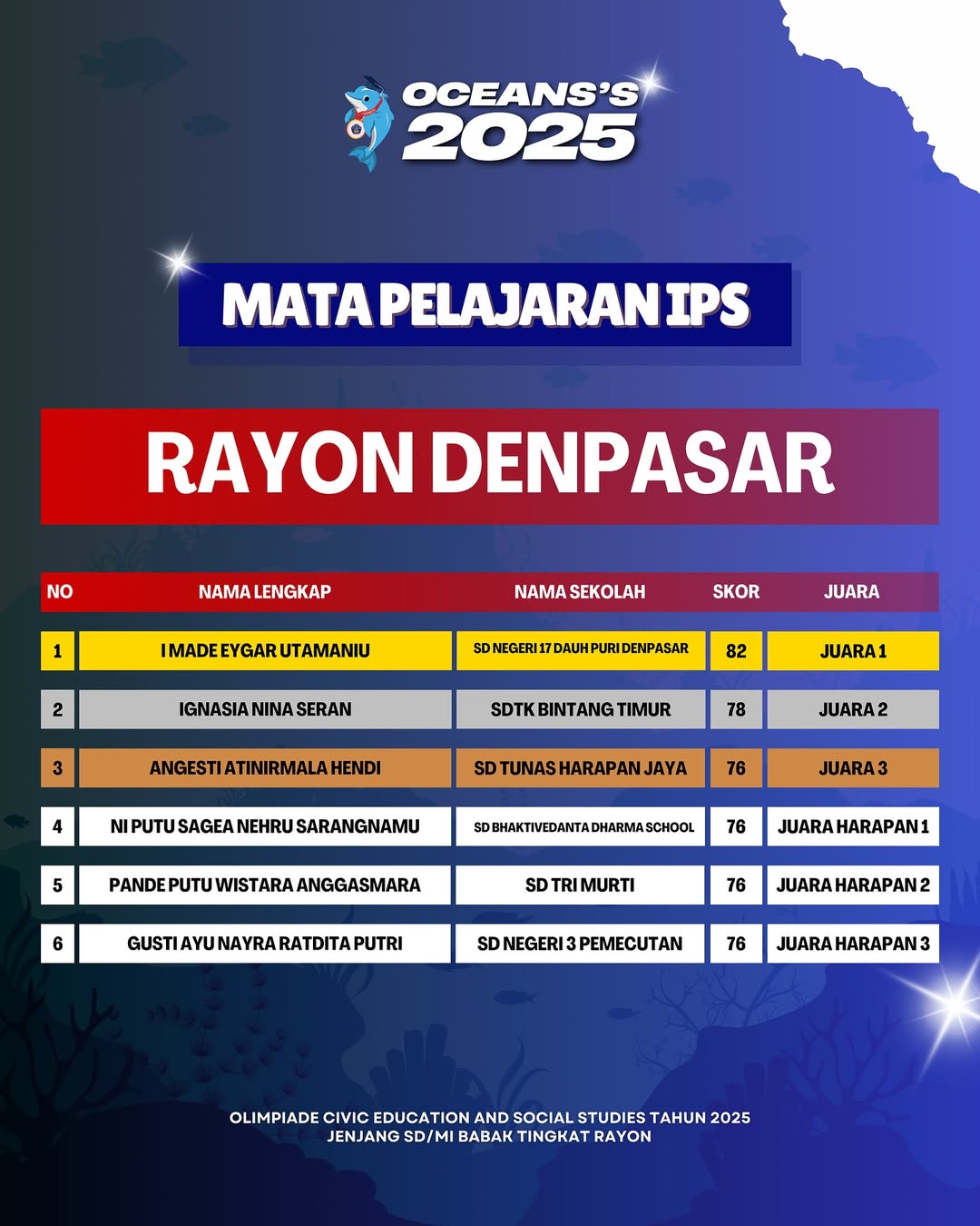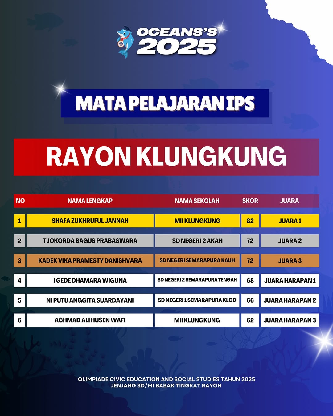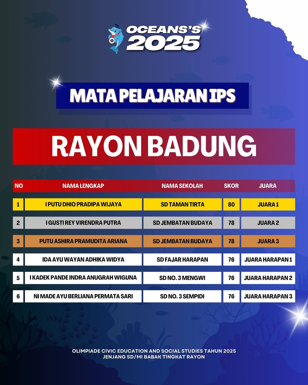 Kami Ucapkan Selamat dan Sukses kepada Juara Tingkat Rayon Olimpiade Civic Education and Social Studies Jenjang SD/MI Mata Pelajaran IPS Tahun 2025. Persiapkan diri lebih matang untuk menghadapi babak tingkat Provinsi seluruh Indonesia.