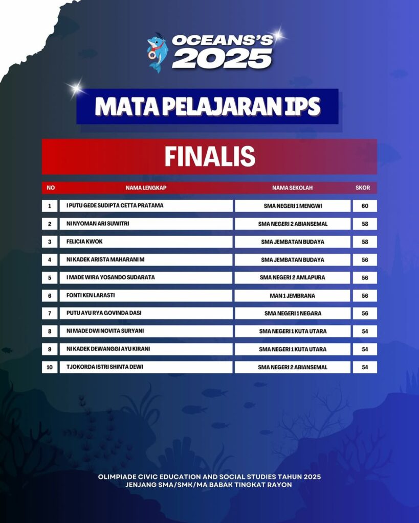Kami Ucapkan Selamat dan Sukses kepada Finalis berdasarkan Akumulasi Nilai Seluruh Rayon Olimpiade Civic Education and Social Studies Jenjang SMA/SMK/MA Mata Pelajaran IPS Tahun 2025. Persiapkan diri lebih matang untuk menghadapi babak tingkat Provinsi seluruh Indonesia.
