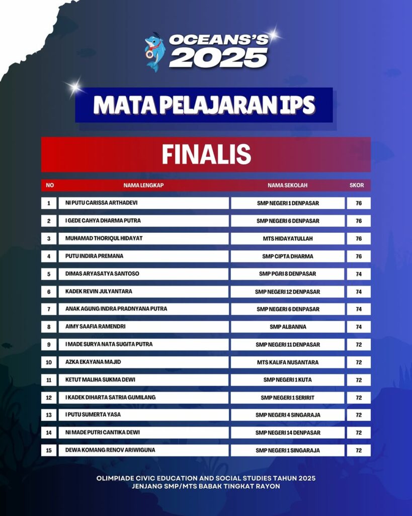 Kami Ucapkan Selamat dan Sukses kepada Finalis berdasarkan Akumulasi Nilai Seluruh Rayon Olimpiade Civic Education and Social Studies Jenjang SMP/MTS Mata Pelajaran PPKn dan IPS Tahun 2025. Persiapkan diri lebih matang untuk menghadapi babak tingkat Provinsi seluruh Indonesia.