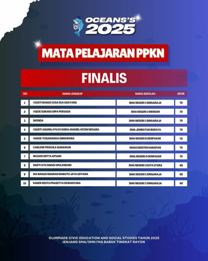 Kami Ucapkan Selamat dan Sukses kepada Finalis berdasarkan Akumulasi Nilai Seluruh Rayon Olimpiade Civic Education and Social Studies Jenjang SMA/SMK/MA Mata Pelajaran PPKn Tahun 2025. Persiapkan diri lebih matang untuk menghadapi babak tingkat Provinsi seluruh Indonesia.