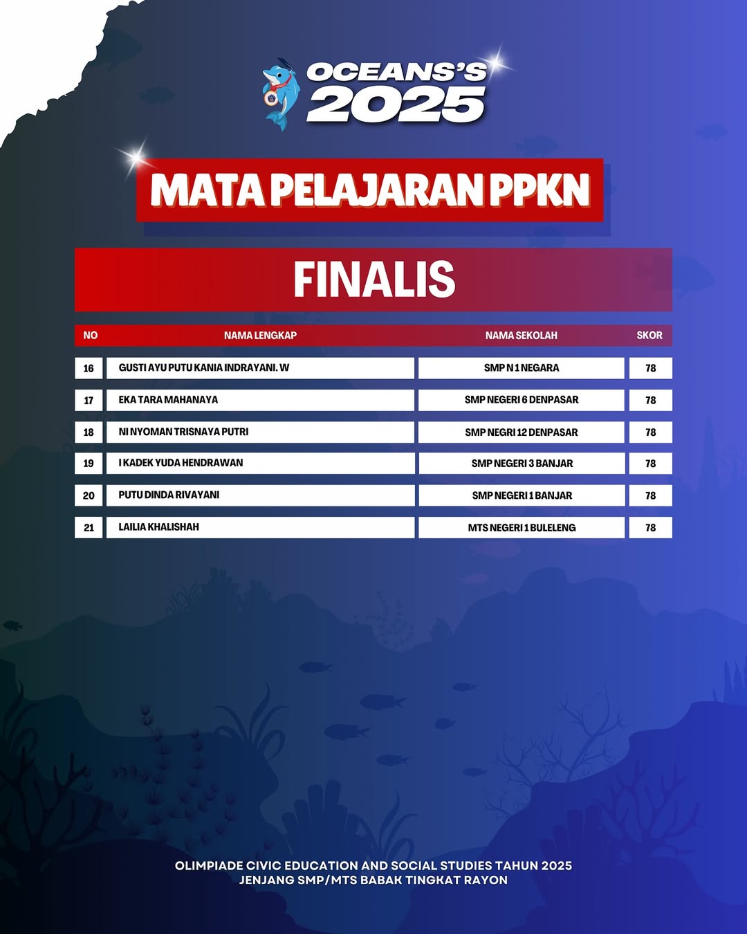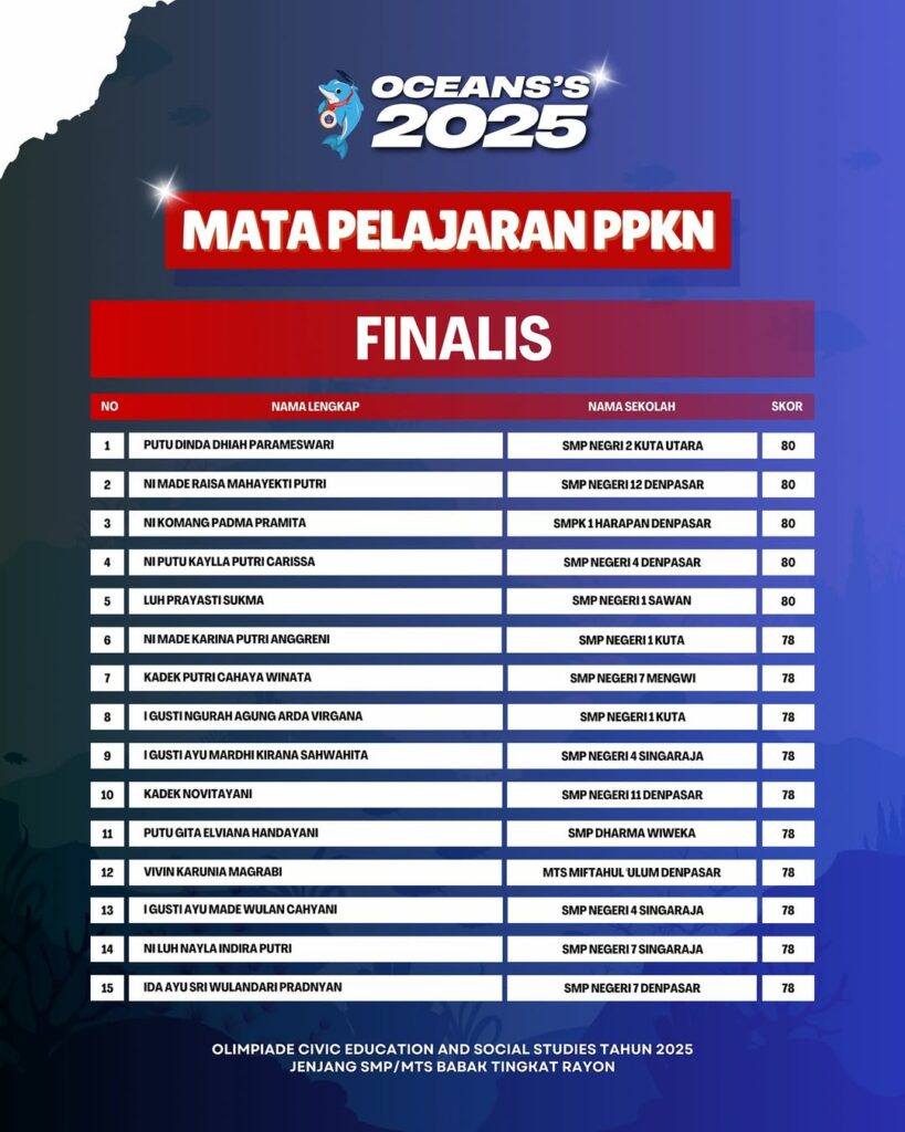 Kami Ucapkan Selamat dan Sukses kepada Finalis berdasarkan Akumulasi Nilai Seluruh Rayon Olimpiade Civic Education and Social Studies Jenjang SMP/MTS Mata Pelajaran PPKn Tahun 2025. Persiapkan diri lebih matang untuk menghadapi babak tingkat Provinsi seluruh Indonesia.