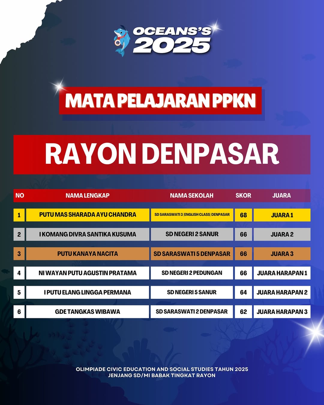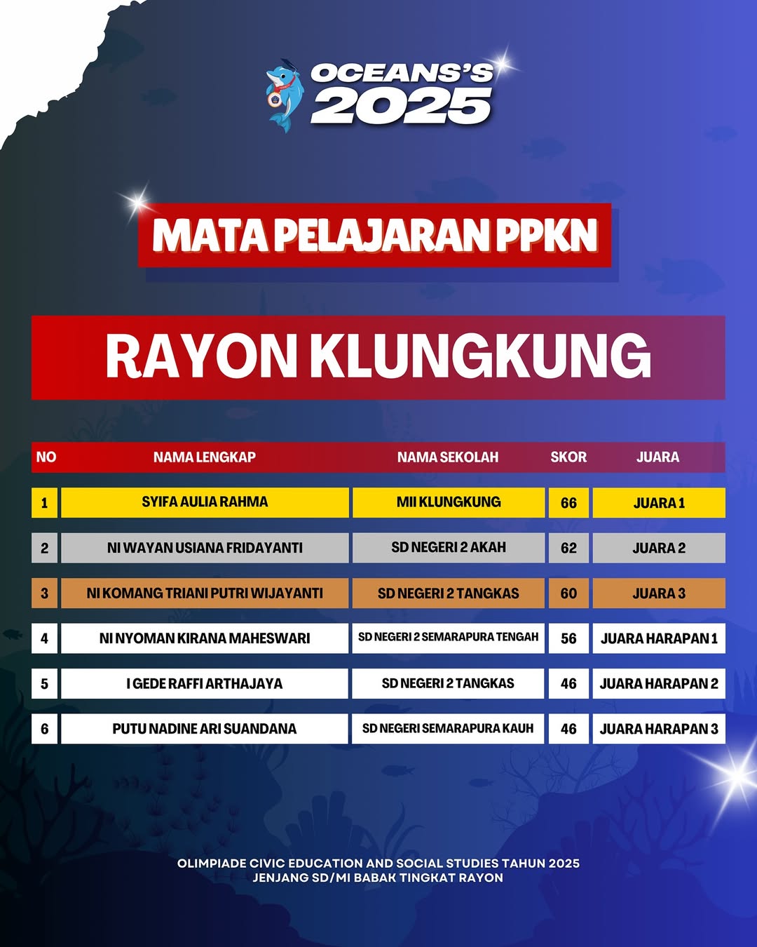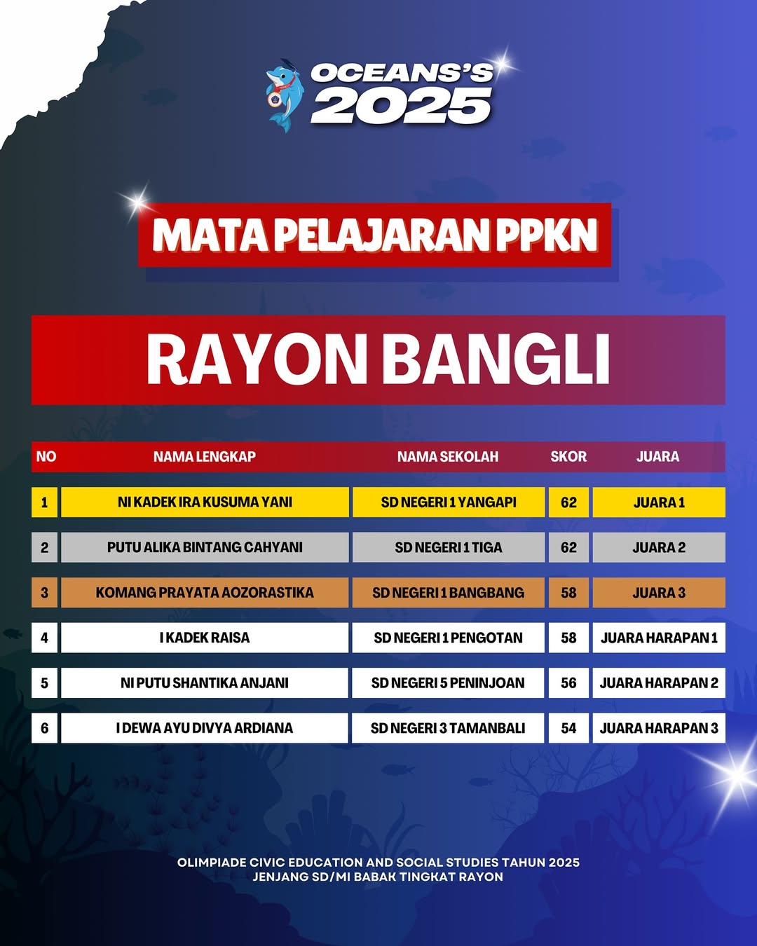 Kami Ucapkan Selamat dan Sukses kepada Juara Tingkat Rayon Olimpiade Civic Education and Social Studies Jenjang SD/MI Mata Pelajaran PPKn Tahun 2025. Persiapkan diri lebih matang untuk menghadapi babak tingkat Provinsi.