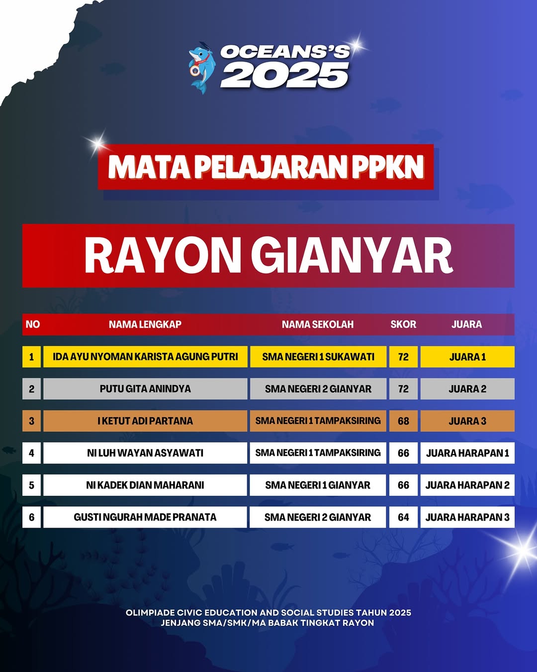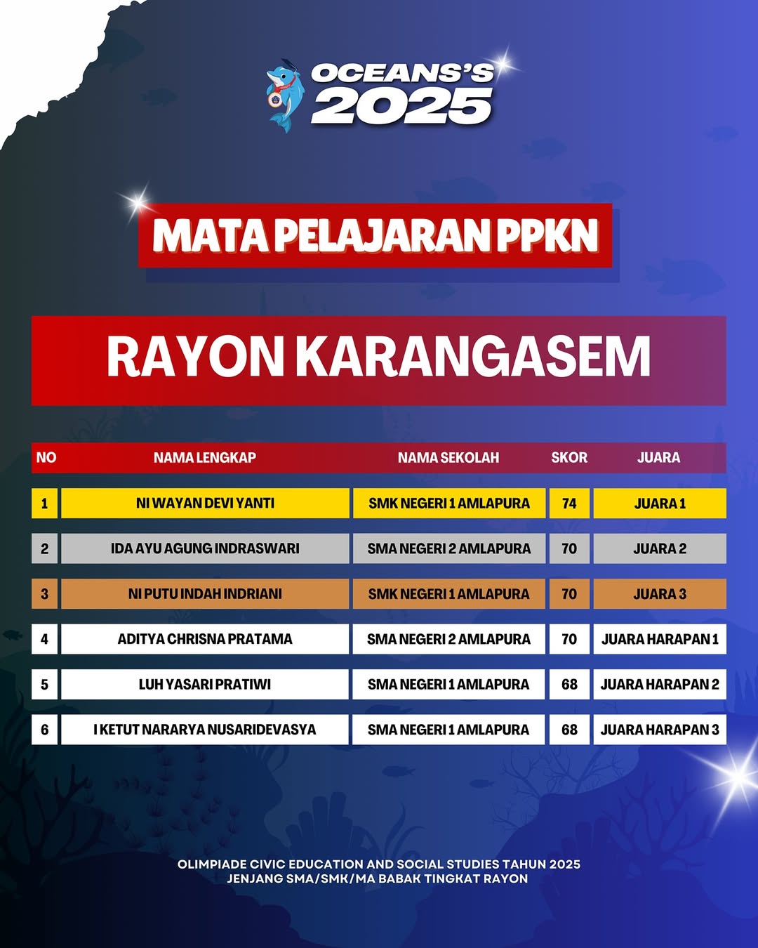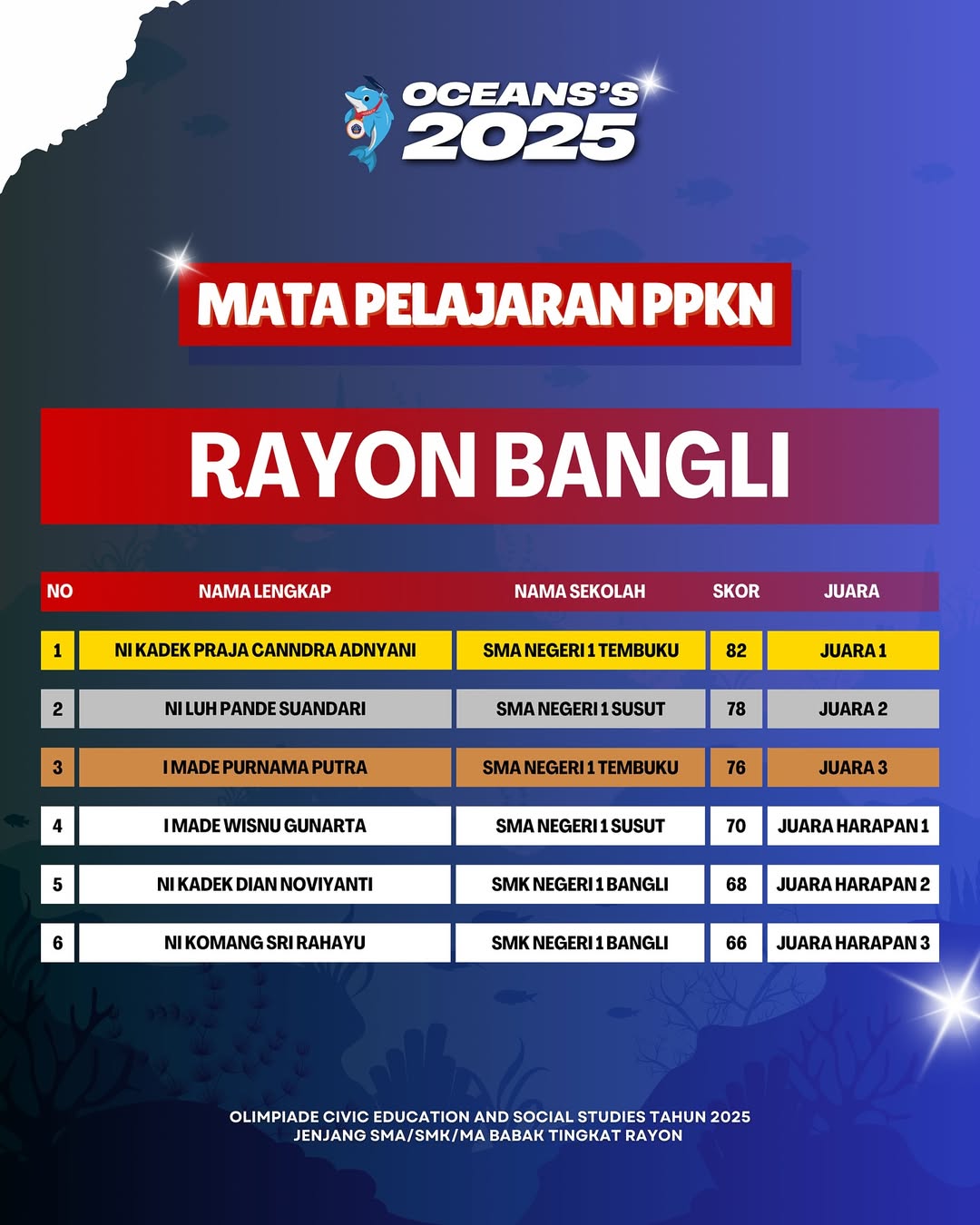 Kami Ucapkan Selamat dan Sukses kepada Finalis berdasarkan Akumulasi Nilai Seluruh Rayon Olimpiade Civic Education and Social Studies Jenjang SMA/SMK/MA Mata Pelajaran PPKn Tahun 2025. Persiapkan diri lebih matang untuk menghadapi babak tingkat Provinsi seluruh Indonesia.