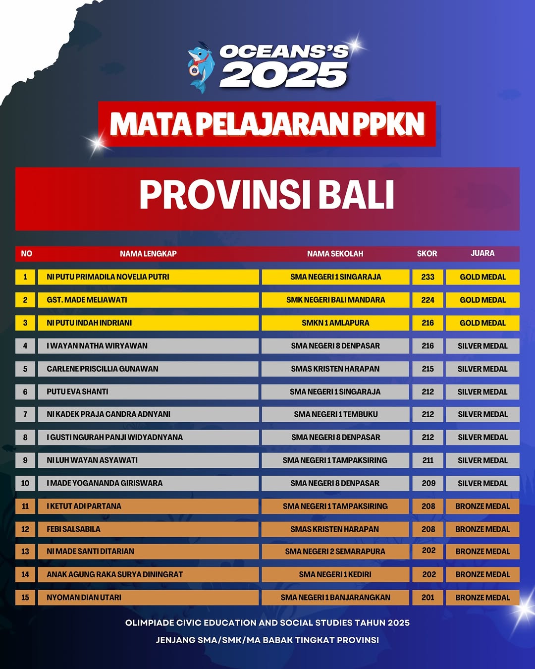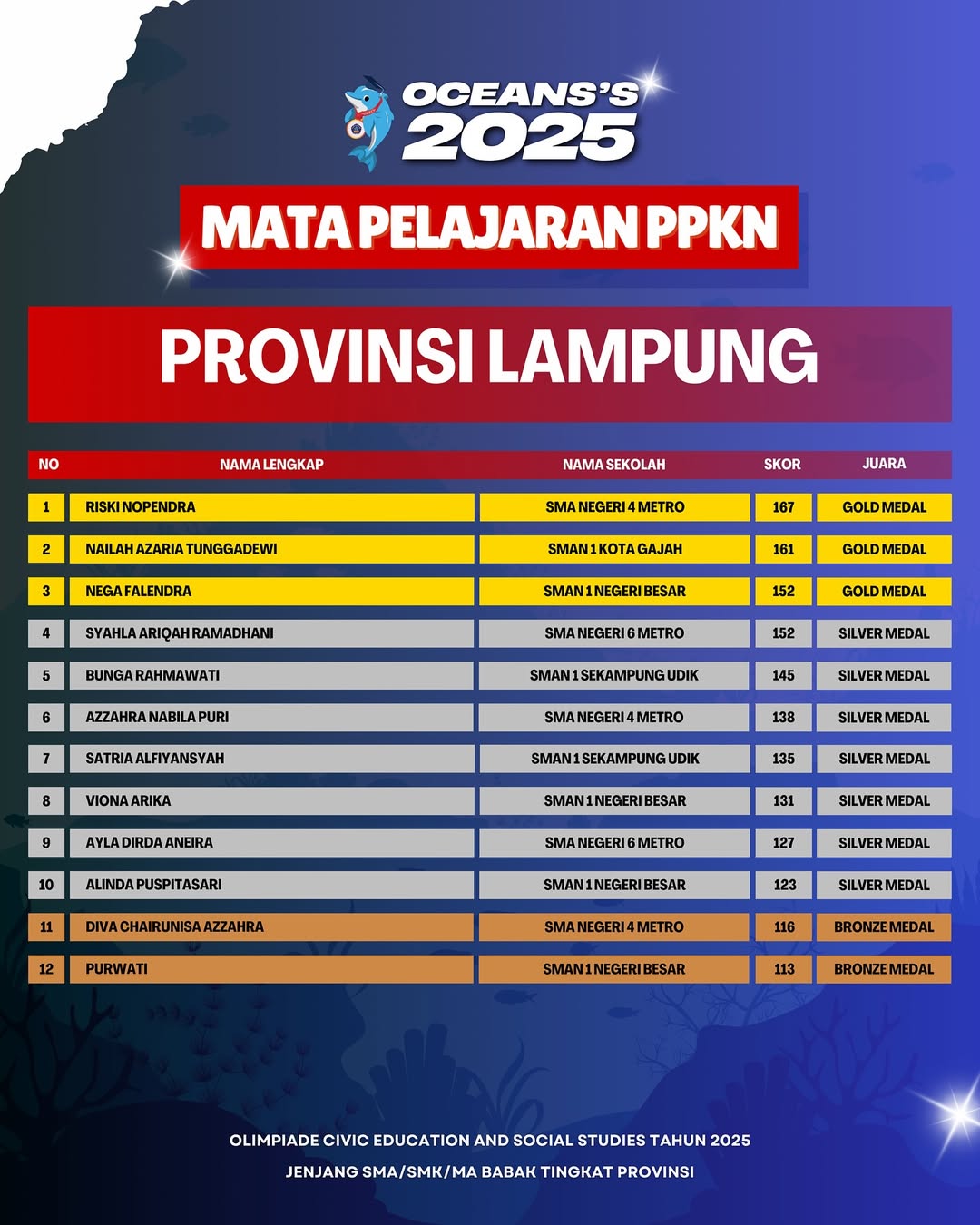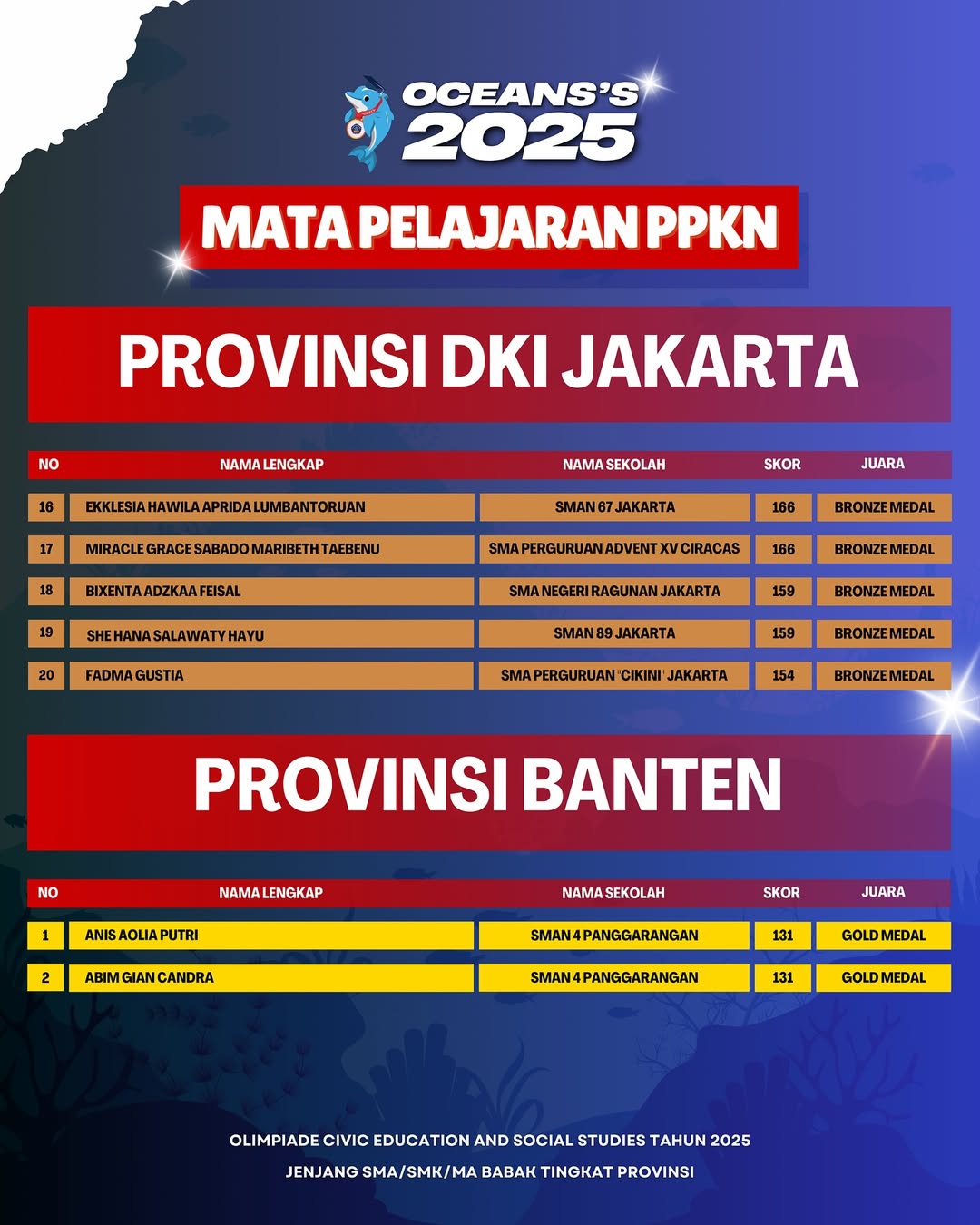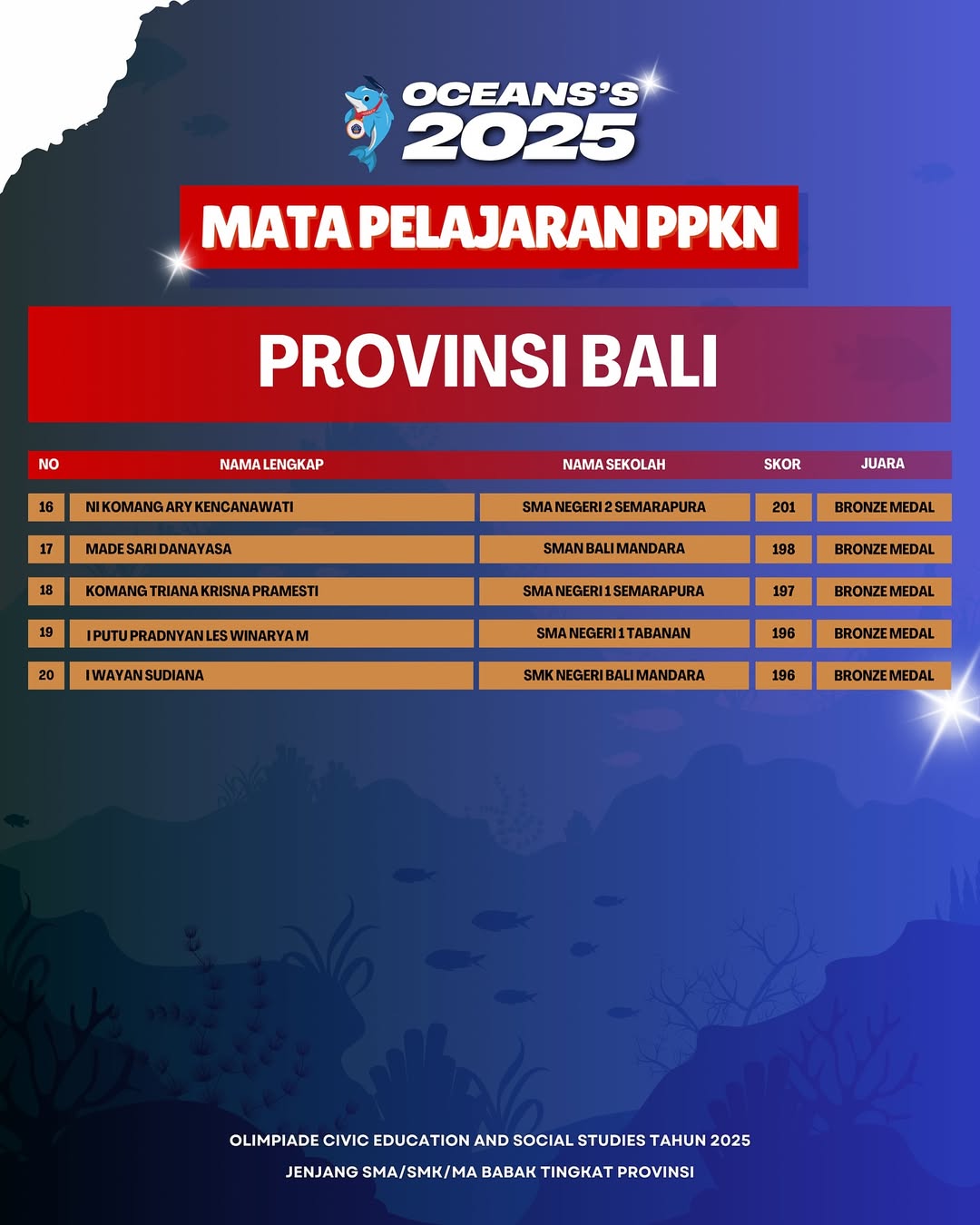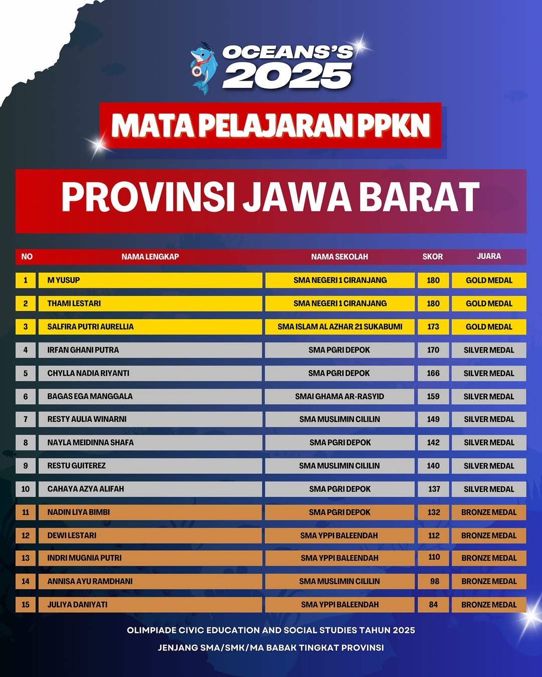 Kami Ucapkan Selamat dan Sukses kepada Finalis berdasarkan dari Hasil Babak Tingkat Provinsi Olimpiade Civic Education and Social Studies Jenjang SMA/SMK/MA Mata Pelajaran PPKN Tahun 2025. Persiapkan diri lebih matang untuk menghadapi babak tingkat Nasional.