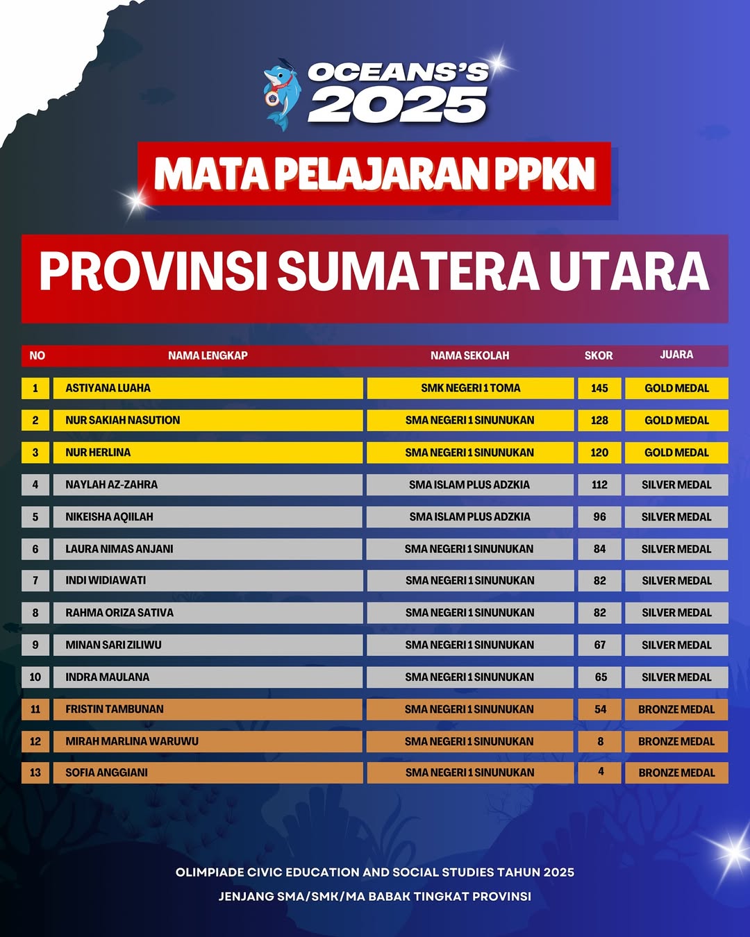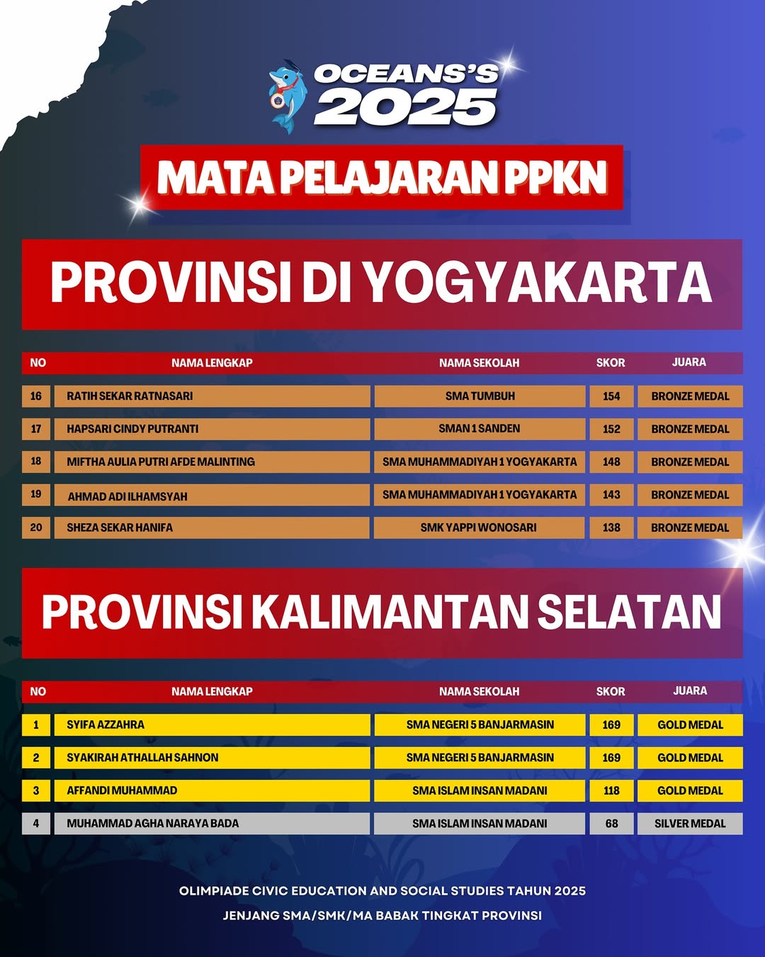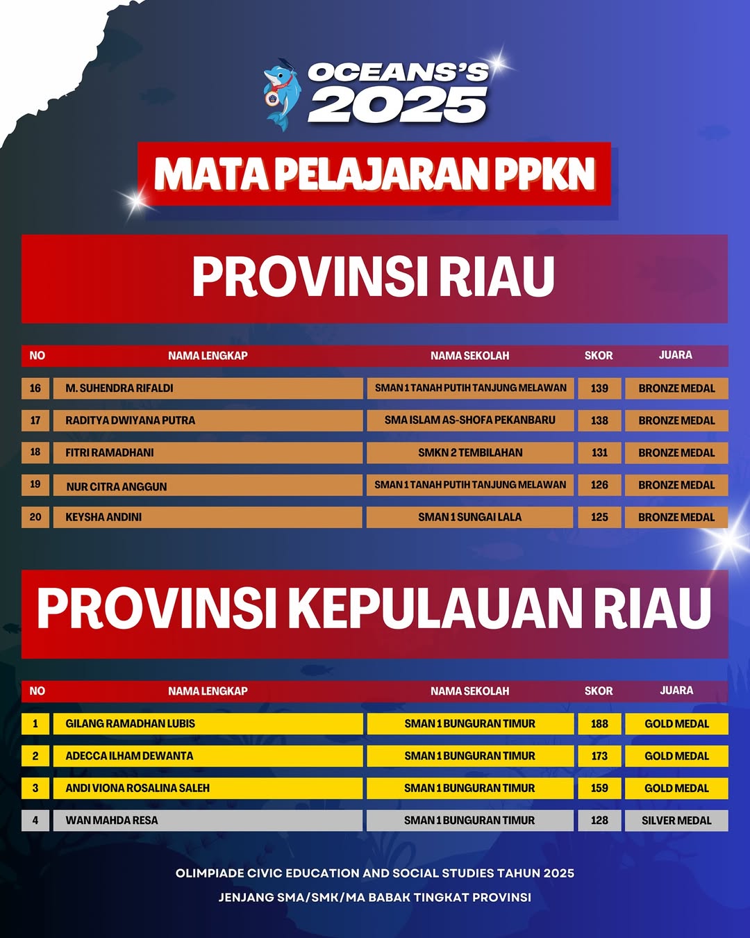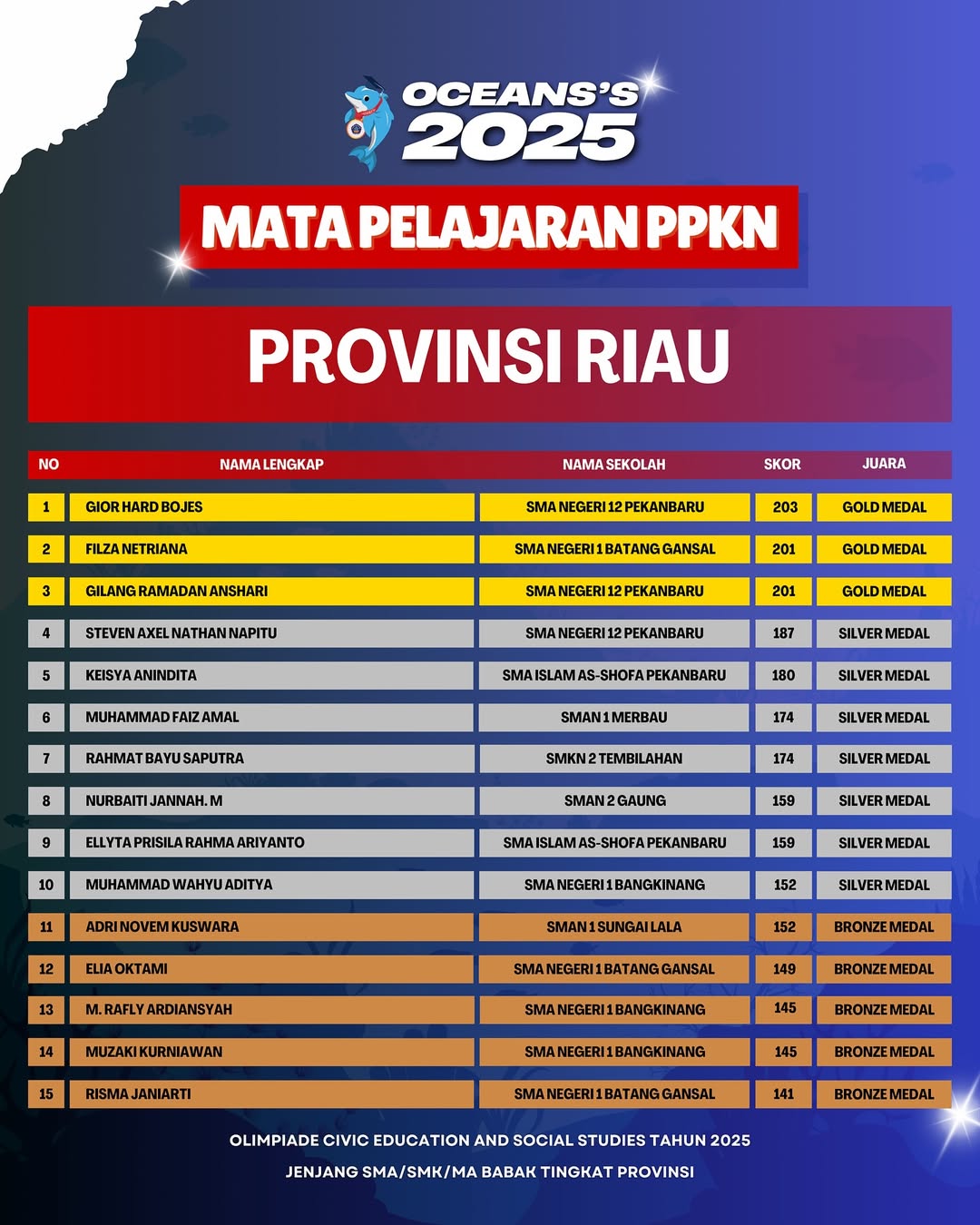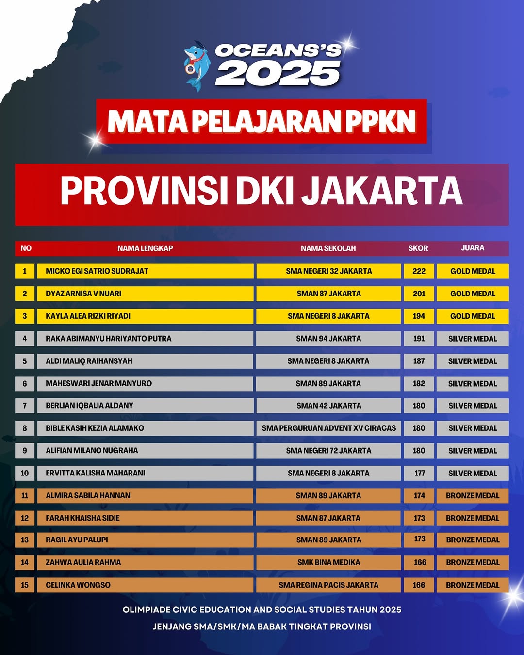 Kami Ucapkan Selamat dan Sukses kepada Finalis berdasarkan dari Hasil Babak Tingkat Provinsi Olimpiade Civic Education and Social Studies Jenjang SMA/SMK/MA Mata Pelajaran PPKN Tahun 2025. Persiapkan diri lebih matang untuk menghadapi babak tingkat Nasional.