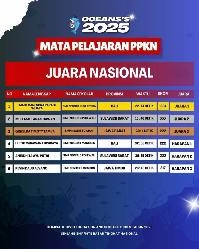 Kami mengucapkan Selamat dan Sukses sebesar-besarnya kepada seluruh Juara Nasional Olimpiade Civic Education and Social Studies (OCEANS’S) Jenjang SMP/MTs, Mata Pelajaran PPKn Tahun 2025! Raihan prestasi di tingkat nasional ini adalah hasil dari semangat belajar, dedikasi, dan kerja keras yang telah kalian tunjukkan selama perlombaan berlangsung.